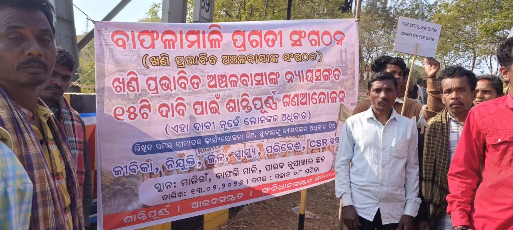 Prakash Thaaki! The Kashipur Bafla Mali Pragati Organization has been holding a peaceful protest on the main road of Bafla Mali since February 13, demanding 15 basic and just demands such as employment and economic development of the residents of the mining-affected areas, restoration and maintenance of the environment, and agricultural and developmental issues. It is understood that the protest has been held at the same place multiple times in the past three months. At various times, the district administration, the Deputy Collector, Rayagada and the Utkal Alumina Project authorities have made no sincere efforts to resolve the problems of the residents of the area and have repeatedly made unilateral comments regarding the Utkal Alumina Project during the talks, alleging that the main problems of the people have been ignored and unilateral comments have been made regarding the Utkal Alumina Project. The Bafla Mali Pragati Organization has responded to the failure of the talks at the Kashipur, Tikiri and Utkal Project offices. Despite the media coverage of the incident, the administration and the project have not shown any sincerity till date, hence the Bafla Mali Pragati Organization has called for a massive mass movement after inspecting the development of Mali sorounding Kupakhal, Karanji Kupakhal, Barjakhal, Jaguguda, Maligaon, Jugabasa kebdi, Durkhal, Telaspari, Chandragiri, Dangeshkhal, Bhramaryodi, Tal Dandabad, Jatthi Dandabad blocks of Kashipur Rayagada district and Kanarfash, Adri, Bamuniguda, Kendumundi, Durmusi, Suryagarh, Maligaon and Gadlaghat blocks of Thuamul Rampur Kalahandi. In this mass movement call program, Habal Naik, Barun Naik, Sanjeev Naik, Thabir Naik, Jagu Majhi, Sanu Majhi, Mansingh Majhi, Basant Naik, Dhabi Naik, Ajay Naik, Ullas Naik, Prithvi Naik and other prominent people were present from the organization.